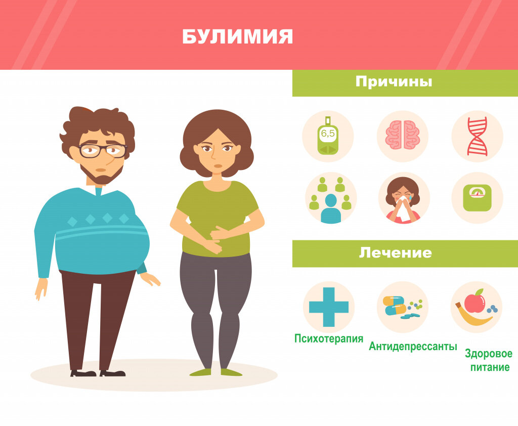 Булимия - это расстройство пищевого поведения, при котором человек съедает большое количество пищи за раз (переедает), а затем избавляется от съеденного, используя различные методы, такие как искусственная рвота, применение клизмы, употребление диуретических средств и химических веществ. Основными признаками булимии являются приступы бесконтрольного употребления большого количества пищи с последующим неприродным опустошением желудка. Булимия является серьезным психическим расстройством, с которым невозможно справиться самостоятельно. Причины развития булимии могут быть различными, включая генетическую предрасположенность, культ стройности в СМИ и обществе, искаженное восприятие собственного тела, низкую самооценку, буллинг в детском и подростковом возрасте. Булимия заметно снижает качество жизни и может угрожать ей, так как приводит к осложнениям переедания и компенсаторного поведения, связанного с ним. Лечение булимии должен контролировать предпочтительно психотерапевт, психиатр и д