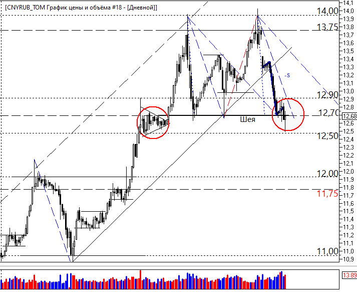 Всем привет! На дневном графике пары cny/rub после роста сформировалась первая медвежья импульсивная пяти волновая модель (-S). На представленном изображении она обозначена синим цветом. Образование медвежьей импульсивной модели после роста на ценовом графике говорит о том, что тренд изменил свое направление с восходящего на нисходящее, так как согласно базовым законам волнового анализа - импульсивные волны выстраиваются вдоль направления текущего тренда. Таким образом, согласно волновому анализу вероятность дальнейшего снижения юаня – возросла. Более того, в результате образования медвежьей импульсивной пятиволновки, на дневном графике зафиксировался прорыв вниз линии шеи у «двойной вершины», с последующим повторным фиксированием цены закрытия ниже уровня линии шеи – 12,70. Таким образом, можно сказать – что «модель подала сигнал на продажу». Таргет – 11,75. Но нужно помнить, что это дневной таймфрейм, и отработка такого сигнала может длиться и месяц и больше. А может и вообще все