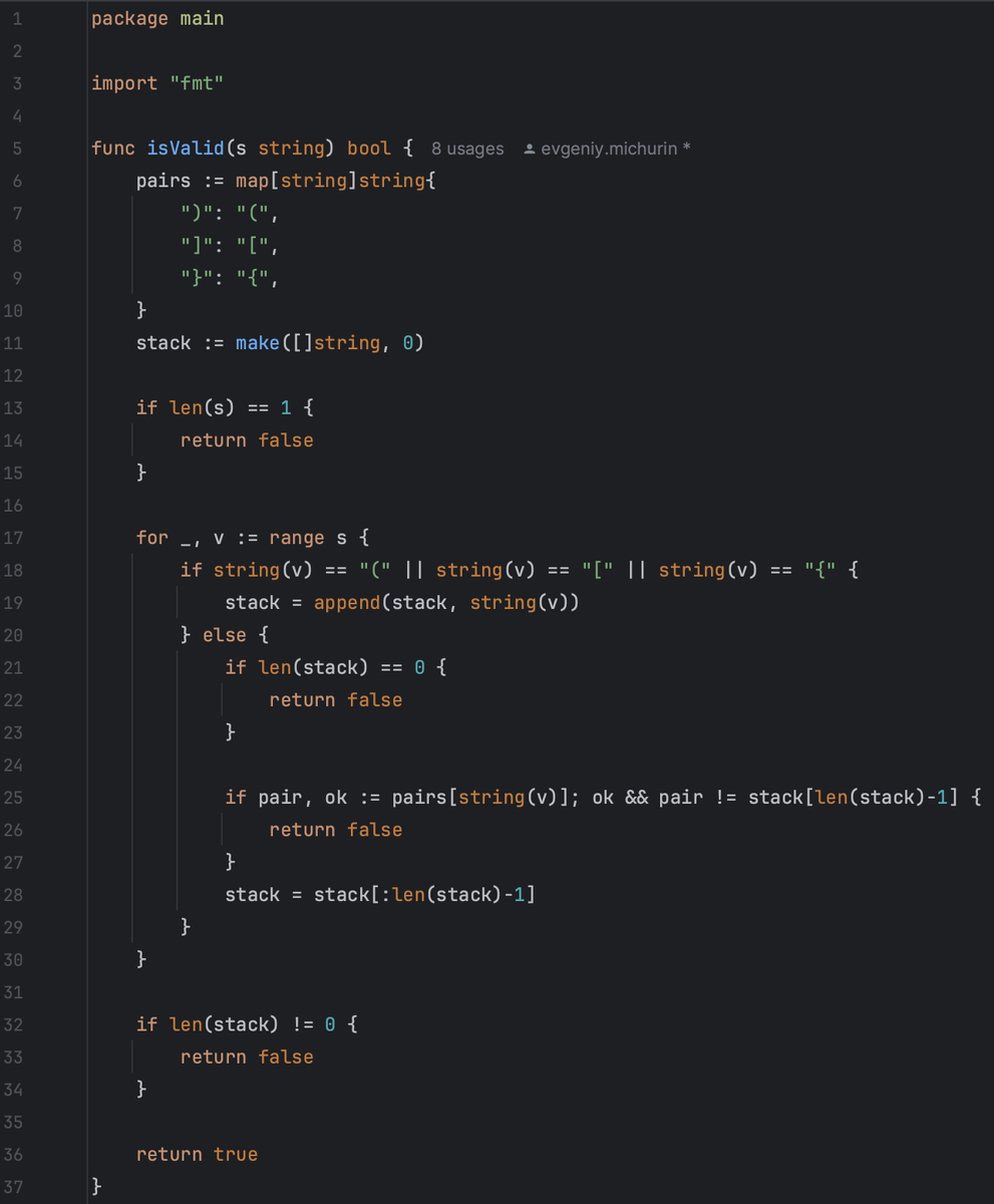 Еще одна очень часто встречающаяся задача на собеседовании. Относится к алгоритмическим, решение должно укладываться по сложности в O(n). Условие: Дана строка содержащая скобки разных видов: '(, ), {, }, [, ]'. Необходимо определить является ли скобочная последовательность правильной, а именно: Начнем с тестовых кейсов, чтобы лучше понять условие: Как будем решать: Вспоминаем такую структуру данных как стек, которая основывается на последовательности LIFO (Last In First Out). Реализация на Go Код можно скопировать здесь Реализация на Python В питоне выглядит лаконичнее за счет наличия метода извлечения элемента из списка.