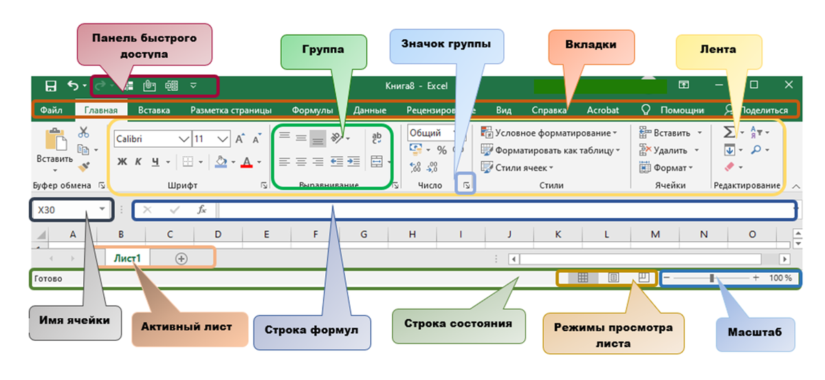 Если вы новичок, то эта информация для вас. Кратко пройдемся по интерфейсу. Панелью очень удобно пользовать, она всегда «под рукой». Есть возможность настроить ее под себя, что я рекомендую сделать. Настройка панели поможет оптимизировать вашу работу и сделает ее удобнее. Более подробно, как настроить панель быстрого доступа, будет описано в следующих материалах. Существует несколько вкладок, каждая вкладка открывает свою ленту. На ленте расположено множество команд, объединённых в группы. Ленту можно скрыть. Эти группы и настройки скрытия ленты мы будем рассматривать отдельно в следующих материалах. В поле Имя отражается адрес или имя выделенной ячейки. Например - B2 (где B – это наименования столбца, а 2 – номер строки). Более подробно о возможностях работы с «Листами» с следующих пастах. В строку формул можно вводить данные, формулы и функции, которые также появятся в выбранной ячейке. Это основы, которые я хотел донести. Обязательно будут более подробные разборы. Порушу подержать