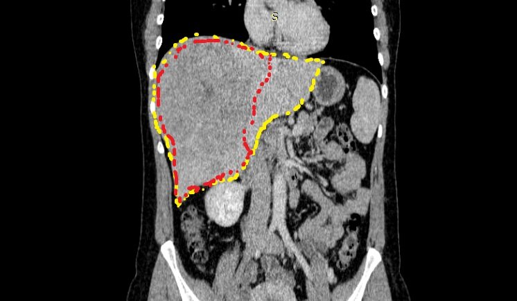 По данным контрольной компьютерной томографии размеры опухоли в правой доле печени составили 117 х 110 мм., практически без динамики в сравнении с предыдущим КТ-исследованием двухмесячной давности (116 х 110 мм).