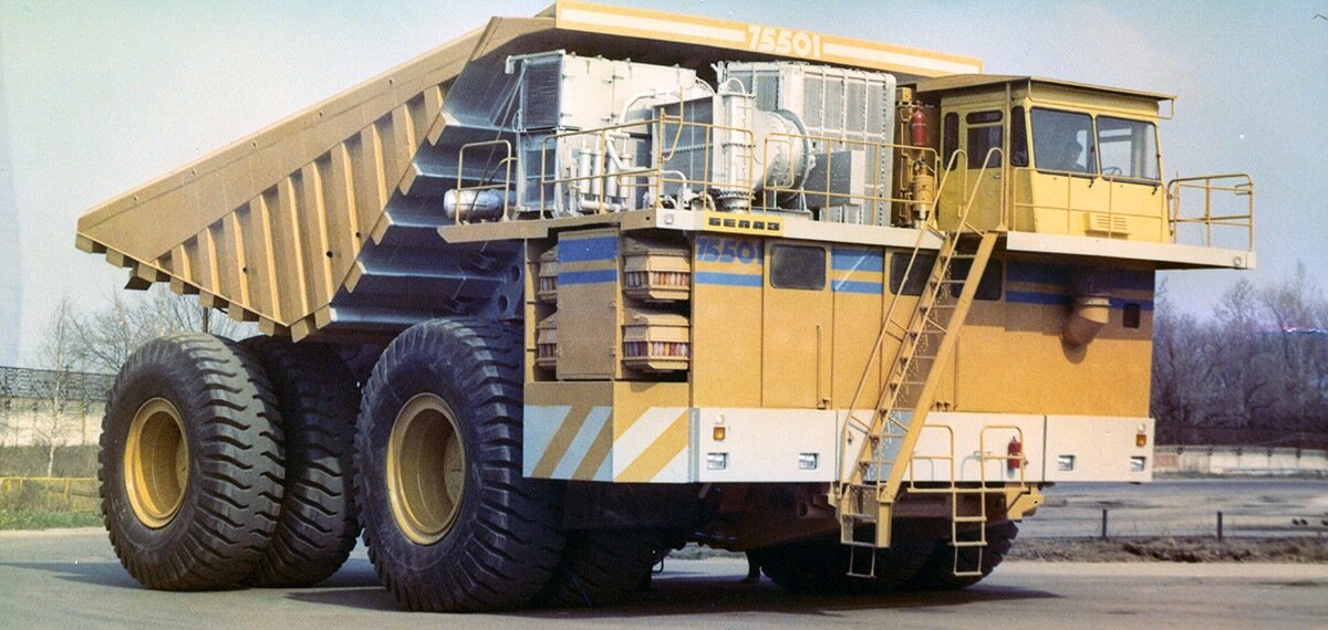 Есть в нашем мире такие области, где требуется особая техника, которая будет их обслуживать. Причем часто она закупается за рубежом, т.к. в нашей стране такого производства нет. Такая же история была и в Советском Союзе, когда большие карьерные самосвалы закупали в других странах и лишь в 80-х годах задумали спроектировать свой образец. Такого рода машины в первую очередь требовались для работы на разного рода рудниках, в том числе и угольной промышленности. За проект взялся Белорусский автомобильный завод, на котором в 1991 году появилась модель БелАЗ-75501. Сразу нужно сказать, что данный самосвал стал первой и последней моделью, которая считается самой крупной в своем роде созданной в СССР. В длину он 15250 мм, ширину 8000 мм и высоту 6770 мм, вес 200 тонн. Конструкцией самосвала стала шарнирно-сочлененная рама с приводом на все колеса. В качестве двигателя стоял дизель-электрический агрегат, мощность его 3152 л.с. Такой мотор разгоняет самосвал до 40 км/ч, но не эта самая полезна