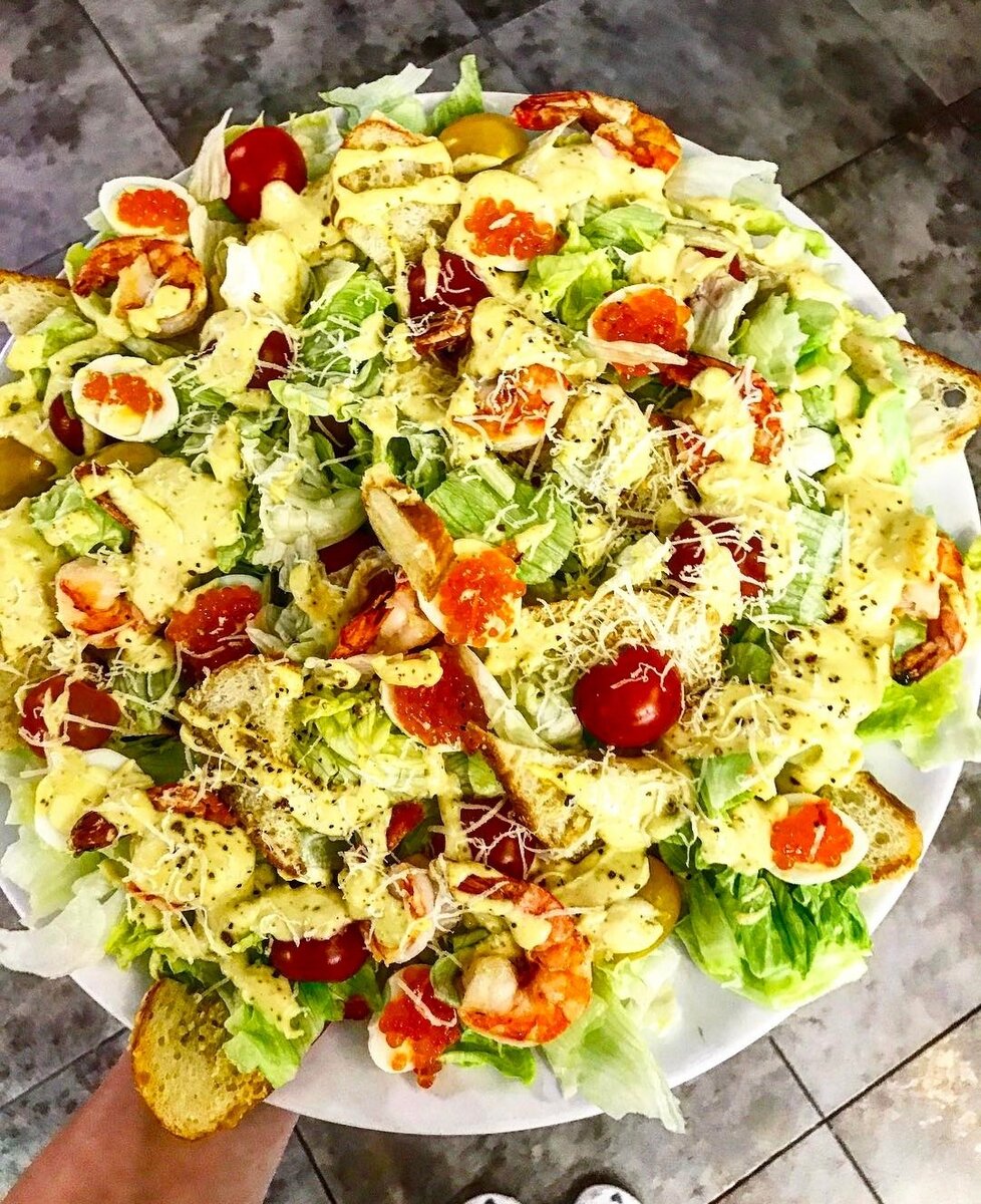 Ингредиенты: * оливковое масло для жарки * 1/3 французского багета * 10-15 кусочков тигровых креветок *2 зубчика чеснока * Перепелиные яйца - 10-15 штук * 1 пучок листьев салата Романо (или салат Айсберг) * 50 г тертого сыра пармезан * Томаты Черри (желтые и красныйюе) 15 штук * Красная икра (на перепелиные яица). Заправка * 2 вареных яичных желтка * 1 ч.л. дижонской горчицы (или французской горчицы ) по вкусу * 1 зубчик чеснока, выдавить * 2 столовые ложки мандаринового сока (1 сладкий мандарин) * 1 столовая ложка яблочного уксуса 9% * 1/3 стакан оливкового масла extra virgin* соль, перец. Положите все ингредиенты в блендер (и взбивайте в течение 2 минут), пока соус не загустеет! Соус должен быть похож на майонез ( с желтоватым оттенком). Приготовление: Очистите креветки, удалите кишечную вену, замаринуйте в оливковом масле с мелко нарезанным чесноком, солью и перцем и дайте постоять 10 минут. Затем обжаривайте на сковороде до золотистого цвета (2-3 минуты). Отварите и очистите я