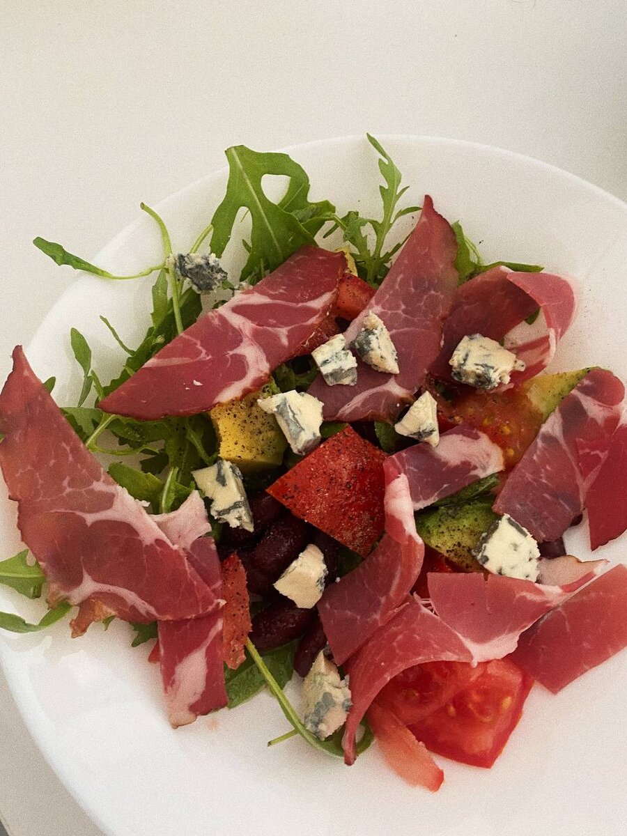 Легкий рецепт безумно вкусного салата, загвоздка в ингредиентах. Ингредиенты для двух порций: Готовим: 1. На рукколу выкладываем нарезанные кубиком томаты и авокадо, красную фасоль 2. Сбрызгиваем салат растительным маслом, присыпаем солью, перцем и сухим чесноком 3. Сверху выкладываем главные вкусовые акценты: сыровяленую шею и сыр с голубой плесенью И всёёёё, это божественно 😭 Ни одного лишнего ингредиента и нечем дополнить 💔