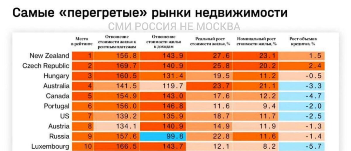 🤬Россия вошла в топ-10 стран мира с самым перегретым рынком недвижимости и в первую четвёрку по реальному росту цены за квадратный метр — Bloomberg. Печальное лидерство.