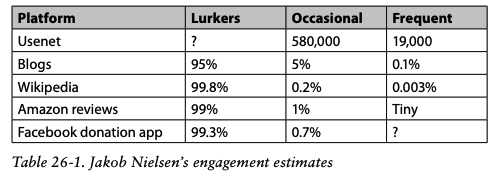 Ведущий консультант по юзабилити в Интернете Якоб Нильсен однажды заметил, что в онлайн-сообществе 90% людей пассивны, 9% вносят свой вклад периодически, а 1% - активны. Его цифры говорят о том, что в воронках взаимодействия действуют законы силы. Эти шаблоны появились еще до появления Интернета — они встречались на онлайн-форумах, таких как CompuServe, AOL и Usenet. В таблице 26-1 приведены некоторые из его оценок.