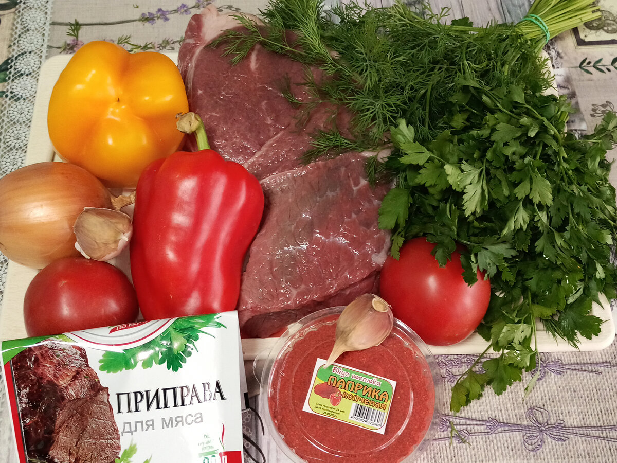 Ароматное ,сытное ,вкусное и не сложное блюдо. ИНГРЕДИЕНТЫ ПРИГОТОВЛЕНИЕ 1.Мясо нарезаем средними кубиками. 2.Болгарский перец нарезаем соломкой. 3.Лук нарезаем полукольцами , а чеснок мелко измельчить ножом или пропустить через пресс. Укроп и петрушку также мелко измельчить. 4.Помидоры измельчить в блендере. 5.В казане разогреваем растительное масло, обжариваем в нем мясо на большом огне до испарения жидкости и золотистой корочки примерно около 15 минут. 6. В мясо добавляем паприку, приправу для мяса и соль по вкусу. Все хорошо перемешиваем и обжариваем 2 минуты. 7. Всыпаем овощи - болгарский перец и лук ,обжариваем в течении 3-5 минут. 8. Добавляем помидоры ,вливаем бульон или горячую воду. Доводим до кипения, пробуем на вкус при необходимости корректируем и тушим под крышкой на слабом огне 40 минут. Если вы хотите лагман в качестве первого блюда, в процессе тушения добавляйте больше воды или бульона. 9. В отдельной кастрюле отвариваем лапшу до готовности. 10. За 5 минут до гото