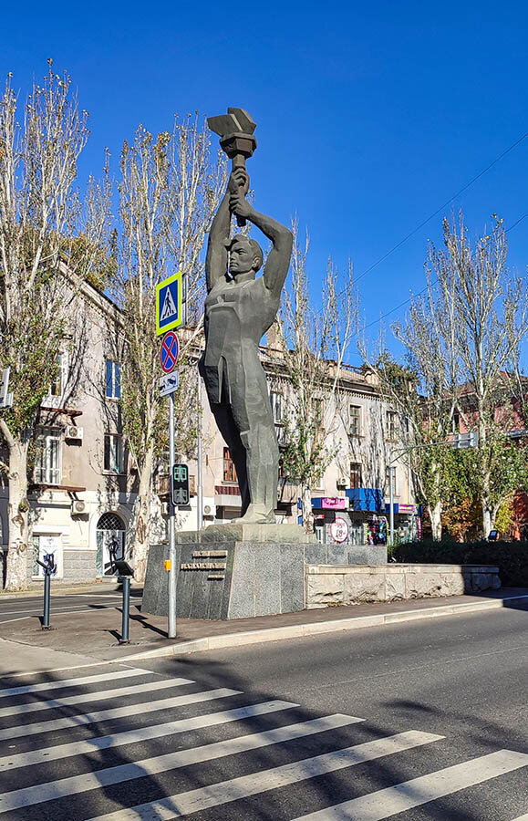 На автостанции меня огорошили новостью - автобус опаздывал с отправлением на два часа. По расписанию он должен был прибыть в 9 утра. Я с грустью задумался над вопросом - во сколько же я приеду в Луганск? Ответ на вопрос я получил, проснувшись в Алчевске (Коммунарске). Было 5 утра. Возник невольный следующий вопрос - Каким образом он проедет 50 км за четыре часа? В Луганск мы должны била прибыть в 9 утра. Должен сказать, что это ему не удалось. В итоге я оказался участником «небывалого случая», когда опаздывая на два часа транспорт приехал на три часа раньше. Что касается дороги: Дорога до Мариуполя не хуже «Тавриды». От Мариуполя к Луганску типично украинская, с множеством колдобин. Немного передохнув мы с братом съездили на кладбище к могилам родителей, после чего отправились гулять по центру Луганска. Должен сказать, что город меня удивил. Удивил в первую очередь тем, что не взирая на 8-милетние регулярные обстрелы и бомбежки города луганчане содержали город в прекрасном состоянии, быстро восстанавливая разрушенное. А уж после прихода России темпы восстановления резко возросли и город находится в прекрасном состоянии. Появилось много памятников. И как говорит брат - впервые за 32 года в Луганске начали ремонтировать дороги. Хотя результаты бомбежек кое-где видны. Но я их в этот день не снимал. Впрочем смотрите сами. Прогулка началась с улицы Советской