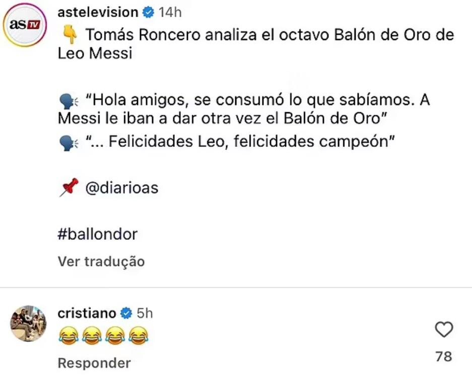 Форвард сборной Португалии и саудовского «Ан-Насра» Криштиану Роналду отреагировал на пост в Instagram (владелец соцсети компания Metа признана в России экстремистской организацией и запрещена), в котором критиковалось вручение аргентинцу Лионеля Месси восьмого «Золотого мяча». Вручение награды Месси высмеял испанский журналист AS Томас Ронсеро. Он сказал: «Он отправился на пенсию в Майами, хотя выглядел как пенсионер еще в ПСЖ, когда готовился к чемпионату мира. Да, он его выиграл, но с шестью пенальти». По словам Ронсеро, Месси заслужил только пять из своих восьми «Золотых мячей». Другие три должны были получить Хави или Андрес Иньеста, Роберт Левандовски и Эрлинг Холанд. Роналду лайкнул этот пост и оставил под публикацией несколько смеющихся смайликов. Накануне Месси в восьмой раз стал обладателем «Золотого мяча» — приза лучшему футболисту мира по версии журнала France Football. Роналду — его ближайший преследователь, португалец получал эту награду пять раз.