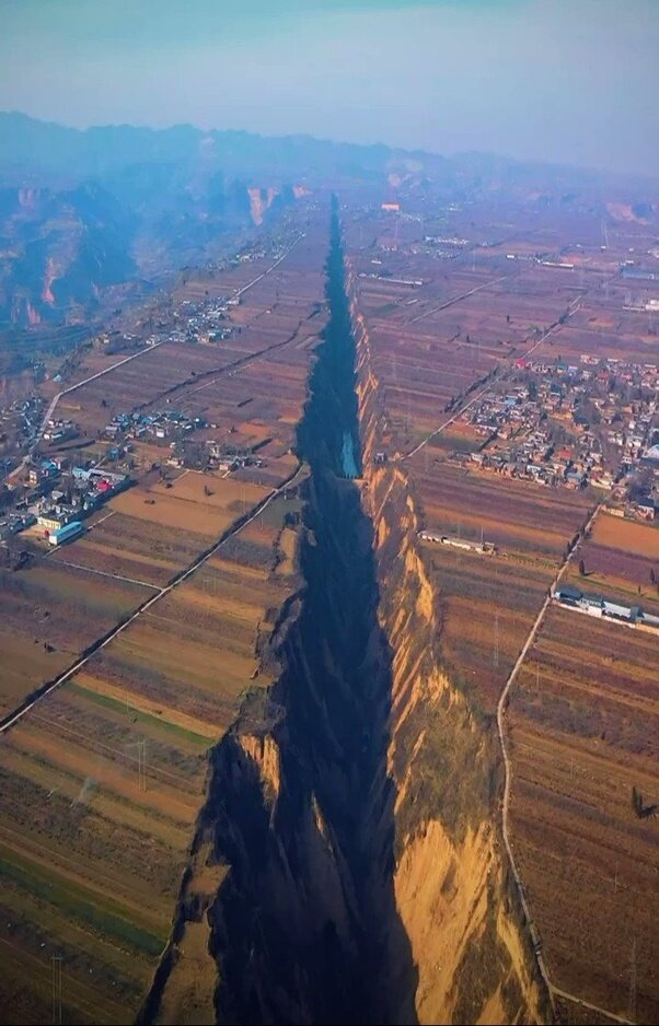 💔 На фото – рифтовый разлом в Китае. Трещина находится в горной местности Пинлу. Длина трещины – 10 км. 🌾👨🌾 Но смелым китайцам все нипочем – они работают на фермах прямо у обрыва. Этот район в Китае пострадал от очень сильных землетрясений, которые в разное время приводили к массовой гибели людей. На фото – лишь одна из трещин, которых много в этой долине. Происходит подобное, когда две тектонические плиты отходят друг от друга. Они в этом месте разрывают земную кору, что приводит к появлению широких и глубоких разломов. Реслер Халк Хоган на собственном примере демонстрирует, как работает рифтовый разлом. Представьте, что каждая его рука - тектоническая плита. А майка - земная кора. 🌊 Трещина будет расходиться на протяжении тысячелетий. В какой-то момент вода заполнит разлом и здесь образуется новое море. Аналогичные разлом есть и на востоке Африки. В будущем он может расколоть африканский континент на две части. Разломы, как правило, увеличиваются довольно медленно - от 1 до 10