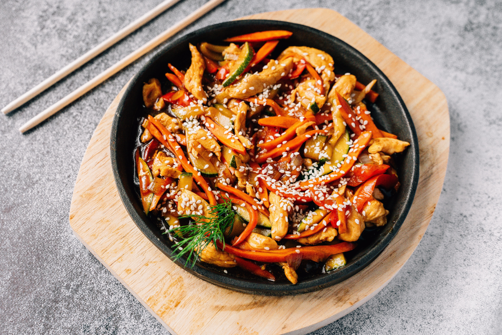 Сочетание сладковатой нотки соуса терияки и натуральной сочности овощей создает симфонию вкусов, которая удовлетворит ваше чувство голода и обеспечит великолепный вкусовой опыт. Богатство цветов и ароматов овощей, дополненное аппетитными кусочками курицы, превращает это блюдо в настоящий кулинарный шедевр, который порадует каждого гурмана. Ингредиенты: Инструкции: