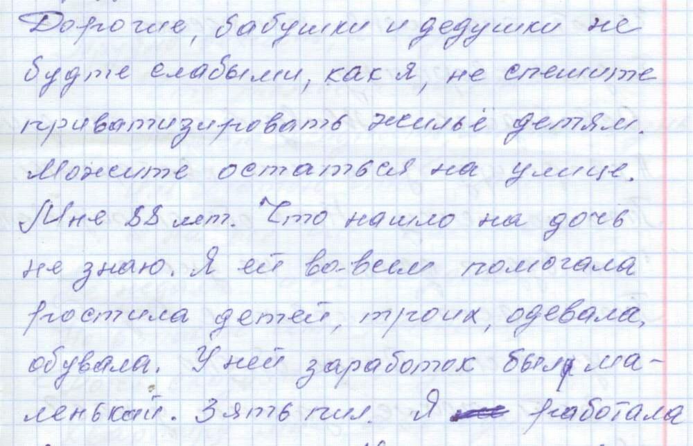 Если можно, опубликуйте мою просьбу к бабушкам и дедушкам. Дорогие, не будьте слабыми, как я, не спешите приватизировать жильё! Можете остаться на улице.