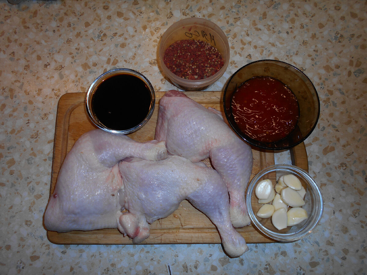 Для приготовления этого рецепта нам потребуется: Для начала мы подготовим сами окорока: отрежем попки и лишнюю часть кожицы. Чеснок нарежем брусочками. В глубокой миске будем соединять наши окорока с соевым соусом, чили, смесь приправ и чеснок. Тщательно все перемешаем и оставим мариноваться 1 час. Включить духовой шкаф на 200*С. На противень положить пергамент и на него выложить наши окорока, слегка полить образовавшимся соусом. Запекать 45-50 минут. Приятного аппетита!