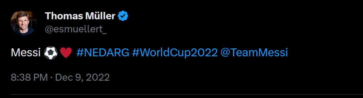 У профессиональных футболистов тоже есть любимые игроки. Месси – кумир миллионов, но чаще всех его успехам радуется Томас Мюллер. «Поздравляю, Лионель 🏆», – написал немец в Твиттере после того, как аргентинец получил восьмой «Золотой мяч». Это далеко не первый случай, когда Мюллер пишет о Месси в Твиттере. Только начиная с ЧМ-2022 Томас 5 раз писал о Лео. Вот так Мюллер отреагировал на победу Аргентины над Нидерландами. «Какой великолепный старт Лионеля», – восхищается немец дебютом Месси в МЛС. Похоже, Томас вниательно следил за многими матчами Лео в американском клубе. Вот еще две реакции на его голы. Несмотря на то, что Мюллер любит потроллить «Барсу» в соцсетях, к Месси у него только одна эмоция – восхищение.