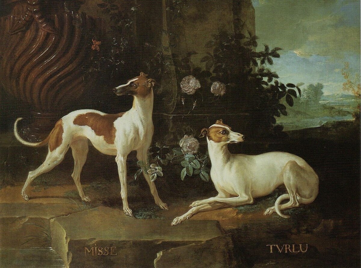 Данная картина считается одним из важнейших произведений искусства, в котором запечатлены уиппеты. Конечно, в то время собаки имели мало общего с нынешними представителями породы, но именно по ним мы можем судить о её развитии. 👉 «Мис (Миссе) и Тюрлю, борзые Людовика XV», Жан-Батист Удри, 1725 год. Эти собаки принадлежали Людовику XV. Их еще можно встретить на других картинах того периода, но в паре – только на этой.