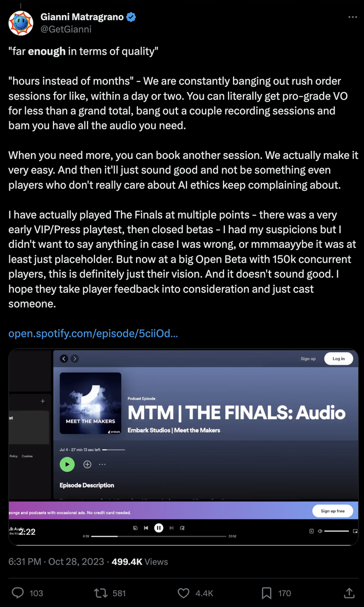 26 октября The Finals от студии Embark Studios перешла в открытую бета-версию. Игроки оценили геймплей, карты и озвучку персонажей. Однако последнее вызвало бурю обсуждений, когда стало известно, что для озвучки персонажей использован искусственный интеллект — решение, которое далеко не все поддерживают. В подкасте Embark главные аудио-дизайнеры, Карл Страндберг и Андреас Альмстрём, рассказали о том, кто стоит за голосами персонажей. Мы используем ИИ с некоторыми исключениями, так что все голоса участников, включая комментаторов, созданы с помощью генератора текст-в-речь. Другие звуки, например, стоны от боли, были записаны естественным образом. Но главный вопрос актеров озвучки заключался в причинах такого решения. По словам разработчиков, благодаря ИИ создание озвучки занимает "всего несколько часов, а не месяцы". Мы выбрали этот путь, потому что технология текст-в-речь теперь на уровне, который позволяет нам быстро адаптироваться к новым идеям... Если у дизайнера игры появляется нов