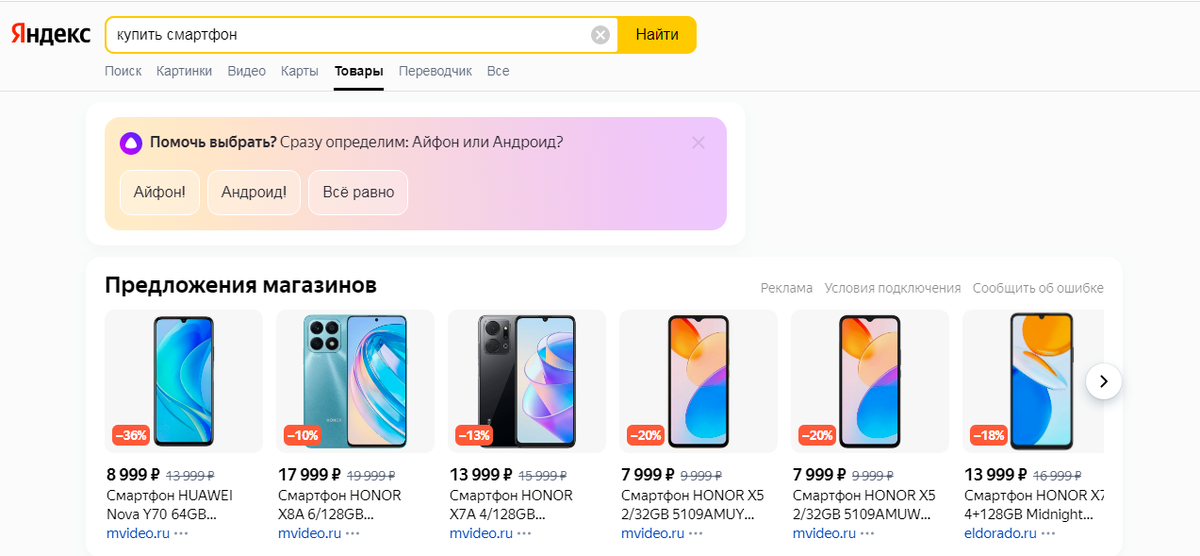 Этот формат рекламы предполагает демонстрацию баннеров с товарами прямо под строкой поиска, опережая текстовые объявления и органические результаты. Карусель товаров в товарной галерее гарантирует немедленный визуальный контакт с потенциальными покупателями. По сути, клиенту показывают фотографии, цены и названия товаров на основе введенного запроса. К тому же все эти предложения доступны на отдельной вкладке "Товары" на платформе Яндекс.