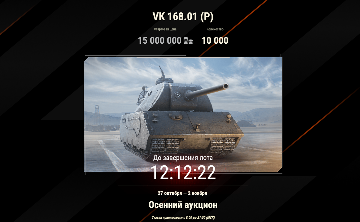 Вот стартанул 4 лот осеннего аукциона на немецкий велосипед VK 168.01 (P) за 15 000 000 серебра, это его минимальная ставка. Хочу посмотреть на него более объективно, стоит ли он внимания?
