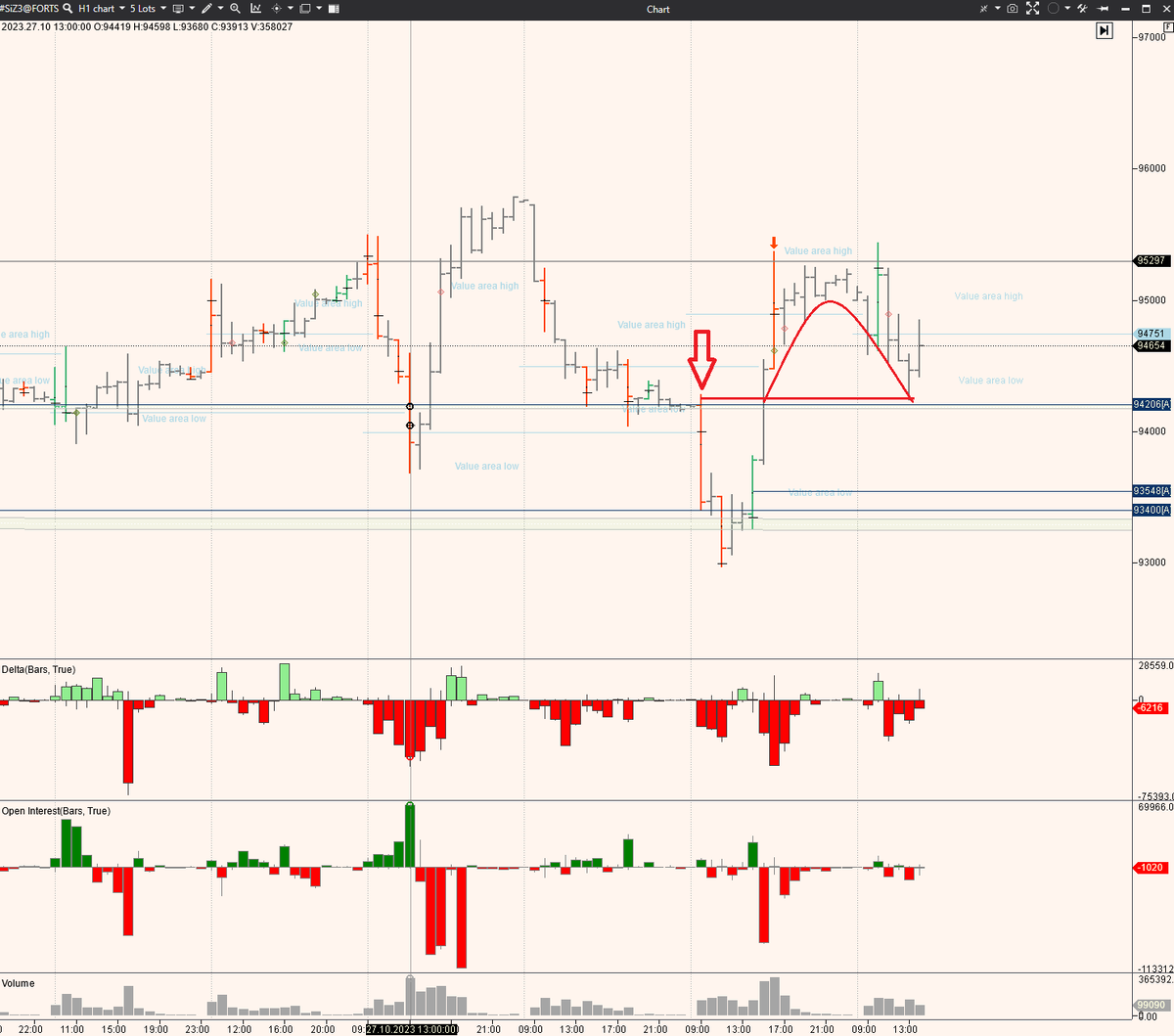 Рассматривая сегодня графики, обратил внимание на появление очень яркой ситуации обратного теста, причем сразу на двух активах. Это идеальный день чтобы рассказать на примерах про этот паттерн. Есть такое свойство, очень полезное для трейдера, это обратные тесты действий. В контексте данной статьи действиями я называю бары с существенной дельтой и растущим открытым интересом. Открытый интерес относится к фьючерсам, на акциях придется обойтись только дельтой. Многое зависит от ликвидности инструмента - чем больше участников рынка проявляют интерес к инструменту, тем более "правильно" он ходит. Не стоит ожидать отработки данного потерна на мало кому интересных активах с пустыми стаканами. Приведу сегодняшний график фьючерса на доллар рубль - Si. На этом графике сегодня очень отчетливо видно, как был произведен обратный тест поглощенного усилия продавца. Продавец обозначен красной стрелочкой, он обладает необходимыми атрибутами - существенная дельта и положительный открытый интерес. Это