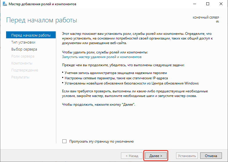 Добавление роли "Доменные службы Active Directory"