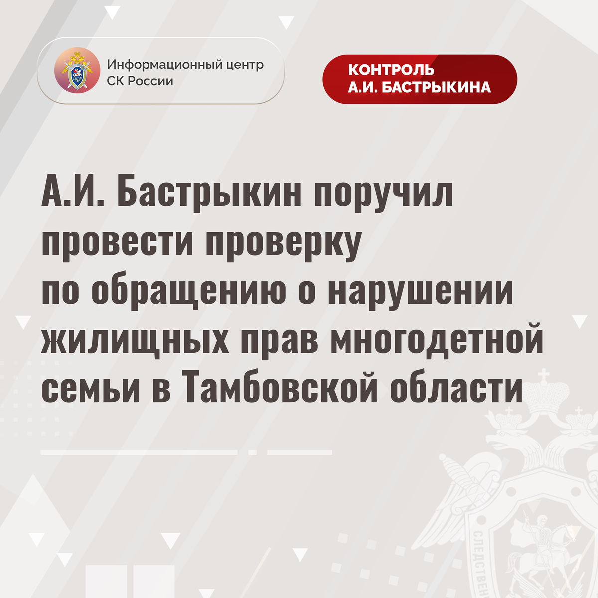 Председатель Следственного комитета Российской Федерации Александр Иванович Бастрыкин поручил руководителю СУ СК России по Тамбовской области Александру Николаевичу Полшакову провести процессуальную проверку и представить доклад о ее предварительных и окончательных результатах.