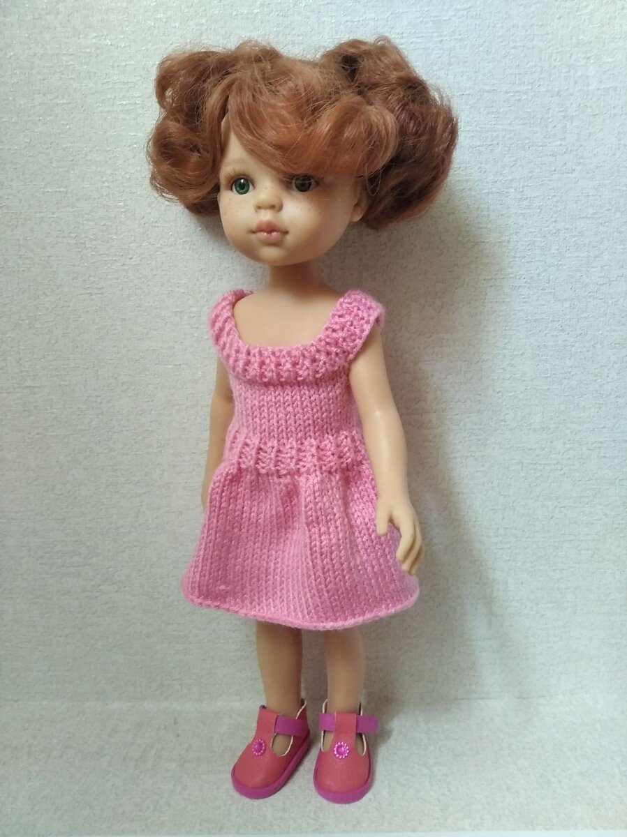 МК вяжем простое платье спицами для Паолы Рейна 32 см. Для работы использую спицы №3. Набираем 70 петель и 4 ряда вяжем резинкой 1х1. 5 ряд: кромочная, 8 лицевых, 17 лицевых закрыть, 18 лицевые, 17 лицевых закрыть, 8 лицевых, кромочная. 6 ряд: кромочная, 8 изнаночных, 4 петель набрать, 18 изнаночных, 4 петель набрать, 8 изнаночных, кромочная. Итого 44 петли. Далее 3 см вязать чулочным полотном (лицевые ряды - все петли лицевые, изнаночные ряды - изнаночные петли). Обозначаем талию: вяжем 4 ряда резинкой 1х1. После резинки увеличиваем количество петель на 41. Для этого вяжем так: кромочная, лицевая, накид, лицевая, накид, лицевая, накид и т.д. до конца ряда. Получившиеся 85 петель (полотно юбки) вяжем на необходимую длину. У меня 6.5 см. Петли закрыть. Отпарить. Выполнить шов. Померить кукле. Спасибо за ВНИМАНИЕ!