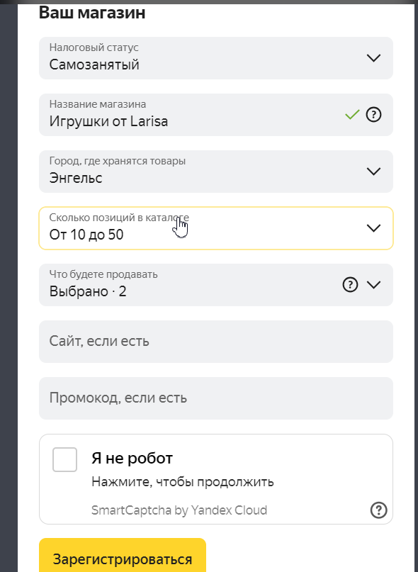 Недостаточно получить статус юридического лица или ИП, оформить самозанятость. Нужно пройти регистрацию на торговой площадке. Для этого нужно зайти на сайт Яндекс.Маркета и пройти регистрацию по кнопке «Стать продавцом».