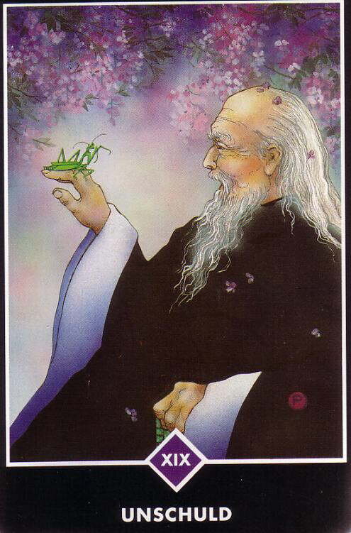Невинность (Солнце). Дзен говорит, что если вы отбрасываете знание и все, что заключено в этом знании - свое имя, личность, все, потому что это было дано вам другими - если вы отбросите все, что было дано вам другими, ваше бытие будет обладать совершенно другим качеством - невинностью. Это будет распятие личности и воскрешение вашей невинности, вы снова станете ребенком, вновь рожденным. Старик, изображенный на этой карте, излучает в мир радость, подобную детской. Его окружает чувство благоволения. Он чувствует себя как дома с самим собой и с тем, что ему принесла жизнь. Кажется, что он игриво общается с богомолом, который сидит на его пальце, как если бы они были лучшими друзьями. Каскад розовых цветов, окружающий его, олицетворяет время освобождения, расслабленности и свежести. Они есть ответ на его присутствие, отражение его собственных качеств. Невинность, которая приходит из глубокого опыта жизни, похожа на детскую, но она не детская. Невинность детей прекрасна, но невежественна.