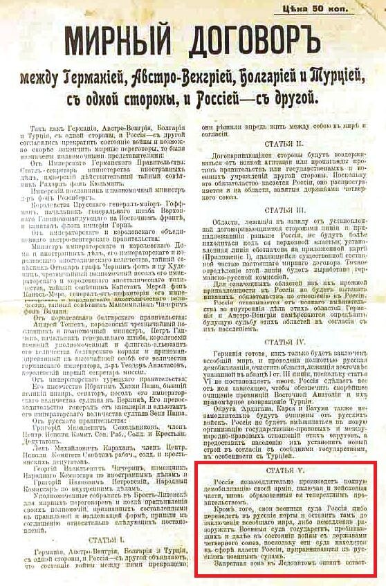 Не, господа, вещи нужно называть своими именами. Политика двойных стандартов была всегда. Глава 5 выглядит так: «Россия незамедлительно произведет полную демобилизацию своей армии, включая и войсковые части, вновь сформированные теперешним правительством. Кроме того, свои военные суда Россия либо переведет в русские порты и оставит там до заключения всеобщего мира, либо немедленно разоружит. Военные суда государств, пребывающих и далее в состоянии войны с державами четверного союза, поскольку эти суда находятся в сфере власти России, приравниваются к русским военным судам. Запретная зона в Ледовитом океане остается в силе до заключения всеобщего мира. В Балтийском море и в подвластных России частях Черного моря немедленно должно начаться удаление минных заграждений. Торговое судоходство в этих морских областях свободно и немедленно возобновляется. Для выработки более точных постановлений, в особенности для опубликования во всеобщее сведение безопасных путей для торговых судов, будут созданы смешанные комиссии. Пути для судоходства должны постоянно содержаться свободными от плавучих мин».