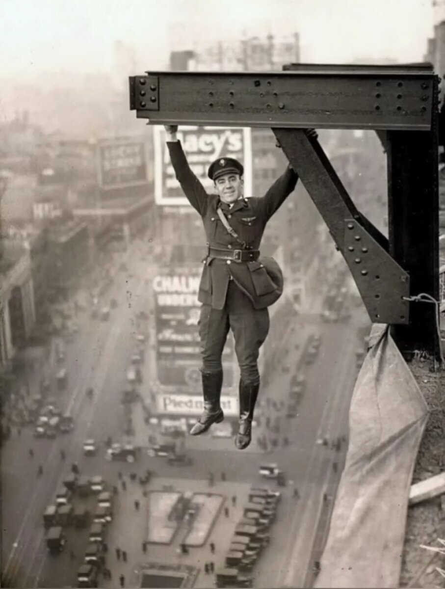 Офицер полиции Нью-Йорка позирует висящим над Таймс-квер 1920 год.