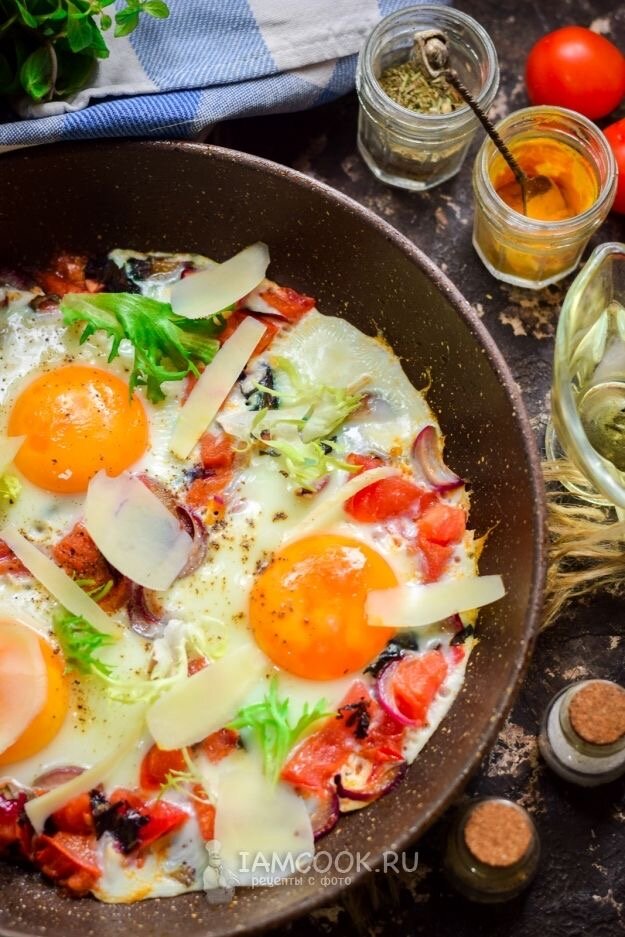 1. Яйца в американском стиле с грибами и спаржей: - Взять 2 яйца и разбить их в миску. - Разогреть сковороду с небольшим количеством масла. - Добавить порезанные грибы и спаржу. Обжарить их на среднем огне до мягкости. - Посолить и поперчить по вкусу. - Вылить в сковороду яйца и готовить до желаемой степени готовности. - Подавать на готовый тост или багет. 2. Пикантные яйца в азиатском стиле: - Взять 2 яйца и аккуратно разбить их в кастрюле. - Добавить в кастрюлю 1/4 чайной ложки карри, молотого кориандра, куркумы и соль по вкусу. - Хорошо перемешать все ингредиенты. - Разогреть сковороду с растительным маслом. - Вылить в сковороду смесь из яиц и специй. - Готовить на среднем огне, помешивая время от времени, пока яйца не сварятся. 3. Глазунья с луком и пекинской капустой: - Взять 2 яйца и аккуратно разбить их в миску. - В сковороде разогреть масло и обжарить нарезанный лук до золотистого цвета. - Добавить нарезанную пекинскую капусту и обжаривать ее до мягкости. - Вылить в сковороду
