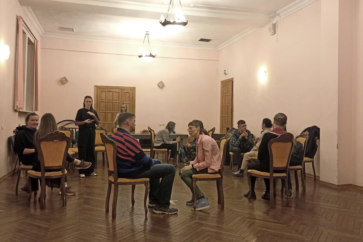 Знакомство прошло театральными методами, через игру. В одной из таких игр удалось узнать, насколько совпадают (или не совпадают) собравшиеся в разных моментах жизни. "Кто, как и я,... ", - а дальше каждый подставлял свою фразу. Выяснилось, что в целом (не)зрители любят театр как вид искусства, многие смотрят понравившиеся спектакли по несколько раз и занимались когда-то в театральной студии (или ставили свои постановки). То есть участники проекта с театральным искусством знакомы и не очень от него далеко, но именно в Калининградской драматическом ещё не были (или были больше 10 лет назад - в детстве на новогоднем празднике). Некоторые даже ходят мимо театрального здания довольно часто, но не заходят внутрь. Все вместе - кураторы и участники - за несколько встреч и постараются понять, почему так происходит и что с этим делать (и нужно ли).