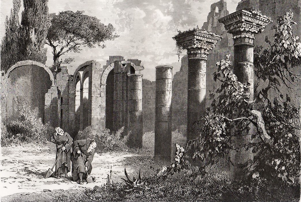 Передо мной старинные гравюры изображают древние руины, людей неприхотливые фигуры бредут среди колонн и капителей. Какая-то тревожная загадка застыла в одночасье. Равнодушно покрыла на века плющом оградка строения гигантского размера. Какая-то чудовищная сила разбила в щепки каменные крыши, и волнами тяжёлая могила засыпала людей песком и глиной. Какая-то на всём печать событий, её сломать мешает наше мненье. И смотрим из придуманных укрытий на мир забытый, но такой красивый. Влекут дворцы, античные постройки, широких лестниц мраморные плиты, стремительные стелы, как высотки, пронзили переменчивое небо; скульптуры, их живые очертанья под складками одежд и покрывала, где лица, погружённые в молчанье, когда-нибудь откроют свои тайны. Их лица светоносные спокойны, без переносиц кажутся надменны, а их тела сильны, всё так же стройны, подобные богам на постаментах. И двери, что высокие в проёмах, ведут в большие залы. Смехотворны в них люди, словно рыбы в водоёмах во все глаза рассма