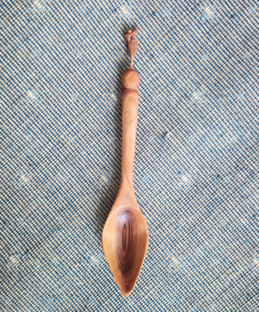 А на нижней части ложки добавлю небольшую еловую веточку с шишкой, выполненную в стиле плоскорельефной резьбы.