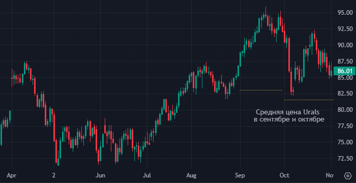 Средняя цена Urals в октябре снизилась до $81,52, дисконт к Brent сократился до $9,57