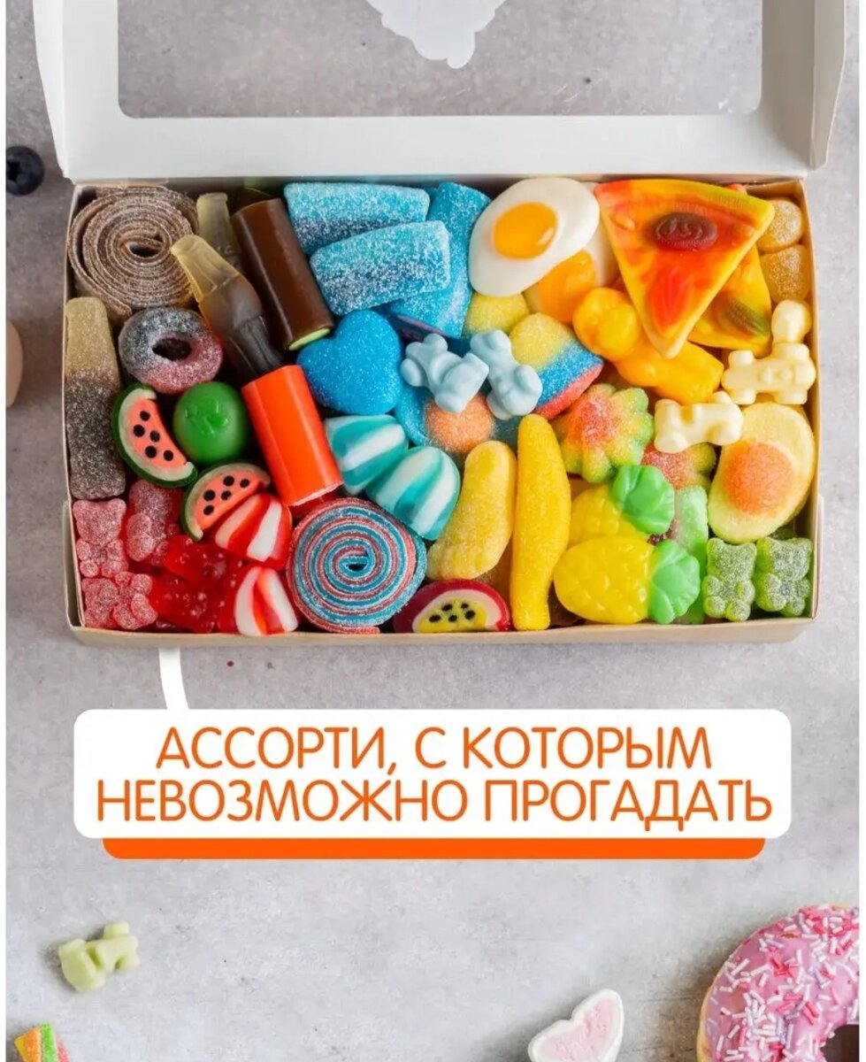 фигурный мармелад подарочный жевательный в боксе кислый и сладкий из 5 стран Европы 45 видов полезные сладости, которые придутся по вкусу всей семье. Мармеладный детский бокс содержит европейские кисло-сладкие желатинки в виде различных забавных фигурок. Вкусные подарки и десерты любят все, Вы можете смело заказывать испанский фигурный мармелад для детей и взрослых. Оригинальный подарок девочке и мальчику, женщине и мужчине. Мармелад жевательный кислый в коробке имеет срок годности 2 года и может храниться при комнатной температуре, не теряя своих вкусовых свойств. Жевательные мармеладки идеально для маленького перекуса в поездке, в дорогу или на прогулке. Набор содержит мармелад ассорти разных видов — фрукты, кока кола, малина, клубника, ягоды, яичница, мишки, мармеладная пицца, кислая лента, ананас, акулы, манго, лягушки, арбуз и множество других. Полезный продукт упакован в крафт коробку с окном. Если хотите удивить своих близких вкусняшками, порадовать взрослых и детей, закажите