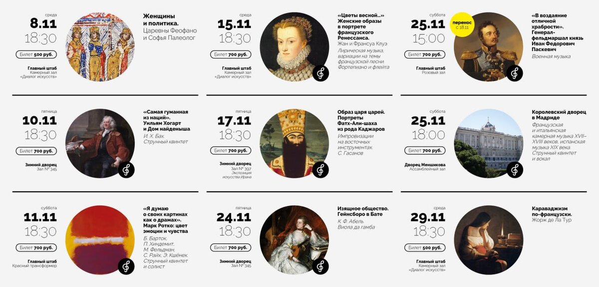 Вечера-концерты в Зимнем дворце, Главном штабе и Меншиковском дворце, а также несколько камерных встреч. → Все билеты на сайте. Билеты также доступны во всех кассах Подробнее о мероприятиях: • 8 ноября заключительная встреча авторского цикла Далилы Абу Хакемах о роли женщин в истории Византии. • 15 ноября начнется абонемент Людмилы Евгеньевны Торшиной «Французские среды». Первая тема посвящена женским образам в портрете французского Ренессанса, а вторая французскому варианту караваджизма. • 17 ноября следующий вечер-концерт из цикла «у эрмитажного шедевра» на третьем этаже Зимнего дворца у портрета Фатх-Али-шаха. • 25 ноября вечер-концерт в Розовом зале Главного штаба, посвященный выдающемуся военачальнику и участнику трех войн фельдмаршалу Ивану Паскевичу. • 10 и 24 ноября вечера-концерты в Зимнем дворце из авторского цикла Алены Алексеевны Петровской «Англия. Неизвестный XVIII век». • 25 ноября вечер-концерт во дворце Меншикова об архитектуре, истории и современной судь