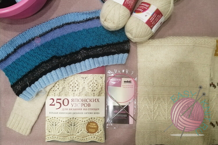 Здравствуйте рукодельницы! Рада поделиться с вами своими новыми процессами, продвижениями в вязании, а также заказами с валдберис: спицами, пряжей и книгой с узорами. Вы можете почитать эту запись, а также посмотреть видео в конце текста. Начну с теплой кофты из "деревеньки" довязала я спинку, постирала в шампуне и кондиционере спинку и 2 полочки. Отжала в полотенце и разложила в расправленном виде на мягкий детский пазл, прикрепив края изделия с помощью наметочных игл. После, как все высохло, полотно красиво расправилось, петельки стали ровными. Части изделий немного изменились в размерах, но не сильно, чуть все вытянулось, а в ширину подсело. Теперь детали соединю вместе, свяжу обвязку по пуговицы и воротник, затем начну вязать рукава. Также я заказывала с валдберис еще 2 моточка Деревеньки, так как полагаю, что 6 мотков будет мало. Новые мотки отличаются от моих запасов, тем что в них много темных жестких волосков, в старых партиях пряжи таких очень мало или же они светлого цвета. Н