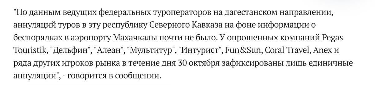 Россияне массово отменяют свои туры в Дагестан из-за инцидента в аэропорту Махачкалы — об этом сообщают в соцсетях. Разбираем фейки. Ищем правду за вас. Подписывайтесь! Однако крупнейшие туроператоры страны не зарегистрировали массовой отмены туров. 30 октября были единичные случаи отмены, что находится в пределах нормы — рассказали в Ассоциации туроператоров России. Эксперты отмечают, что туристы не торопятся отменять поездки и хотят удостовериться, что ситуация стабилизируется. Спрос на путевки в Дагестане может уменьшиться, но массовой отмены не ожидается. Кроме того, согласно данным Министерства туризма РФ, некоторые туры временно переносились из-за приостановки функционирования аэропорта. 31 октября аэропорт возобновил свою работу, а отели и туристические компании работают в штатном режиме. Разбираем фейки. Ищем правду за вас. Подписывайтесь!