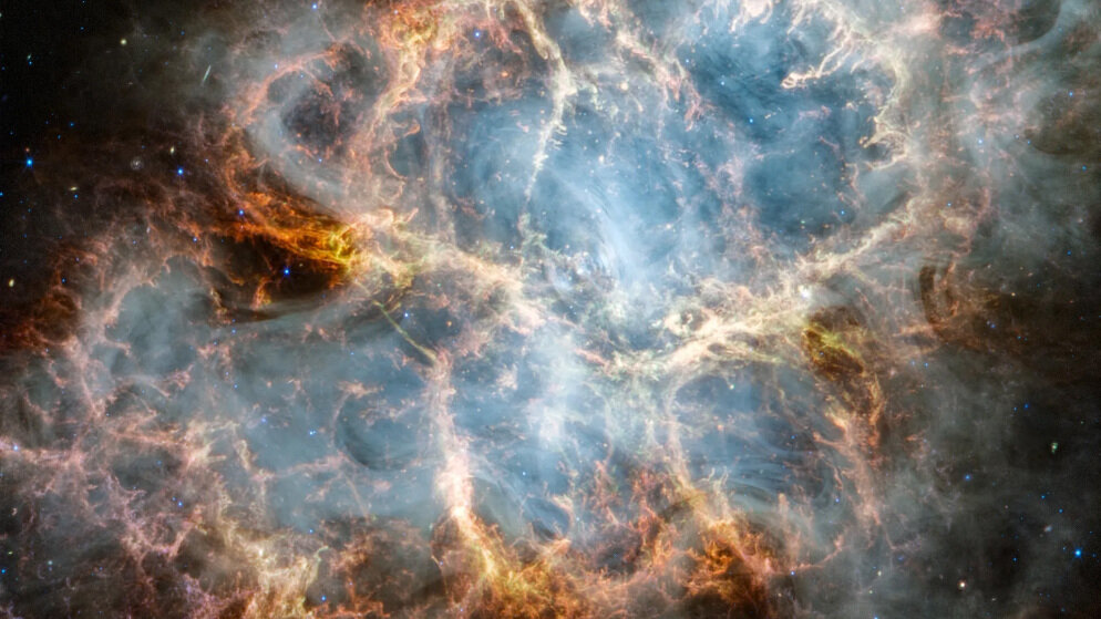 Команда астрономов под руководством Теи Темим из Принстонского университета намерена узнать больше о происхождении Крабовидной туманности с помощью зорких глаз "Уэбба". Изображение представляет собой совокупность данных двух основных инструментов телескопа: MIRI (прибор среднего инфракрасного диапазона) и NIRCam (камера ближнего инфракрасного диапазона). «Благодаря высокой чувствительности и объемному разрешению "Уэбба" астрономы теперь могут точно установить, из чего состоит материал, выброшенный взрывом, в частности, сколько в нем никеля и железа, которые могут подсказать ученым, какой вид взрыва образовал эту туманность, напоминающую краба», — сообщила Темим.