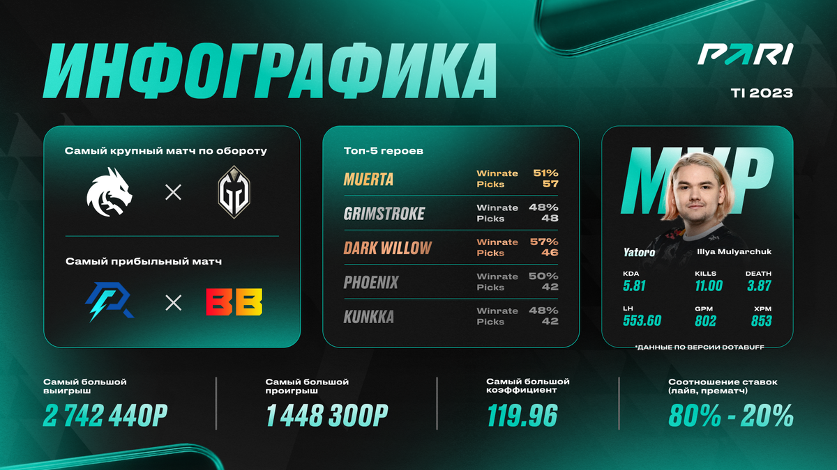Самая крупная победная ставка на The International 2023 была сделана на вторую карту в матче LGD против Gladiators. Клиент в лайве поставил 1 482 400 рублей на европейский ростер с коэффициентом 1,85, благодаря чему выиграл 2 742 440 рублей. Чуть раньше миллион рублей был поставлен на победу Nouns на второй карте в серии против TSM. Благодаря удачному сплитпушу и грамотной тактической игре K1 на Phantom Lancer пользователь заработал 2 200 000 рублей. Один из клиентов PARI поставил 1 095 000 рублей на победу Liquid на первой карте в матче против Gladiators в плей-офф нижней сетки. MiCKe на Luna сумел совершить камбэк в красивом сражении на Рошане и принес пользователю 2 244 750 рублей. Другой пользователь выиграл 1 871 205 рублей благодаря ставке на победу Talon на первой карте против BB Team с коэффициентом 2,54. Игра длилась более часа, а Talon была в шаге от поражения, но в итоге все-таки сломала трон оппонента. Другой клиент PARI собрал удачный экспресс с коэффициентом 2,75, в котором объединил победу Spirit над Liquid, LGD над Azure Ray и Gladiators над Nouns. В итоге его 502 000 рублей трансформировались в 1 381 391 рубль.