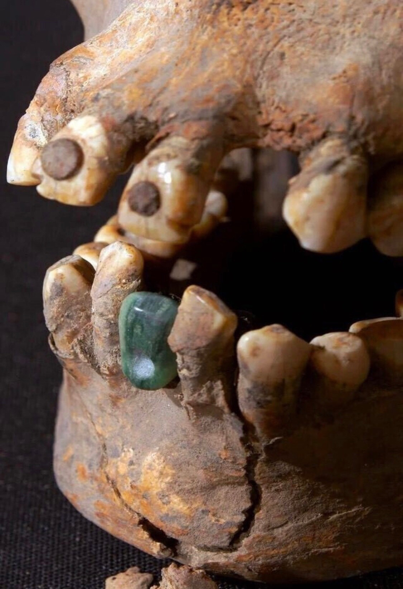 Вот это находочка!!! Череп женщины из Теотиуакана с нефритовым зубом-имплантом. Верхние резцы женщины украшены круглыми камнями пирита. Такую технику практиковали в городах майя на юге Мексики, в Гватемале и Белизе. 350-450 гг. н.э. Мексика Ваша реакция,если б нашли?