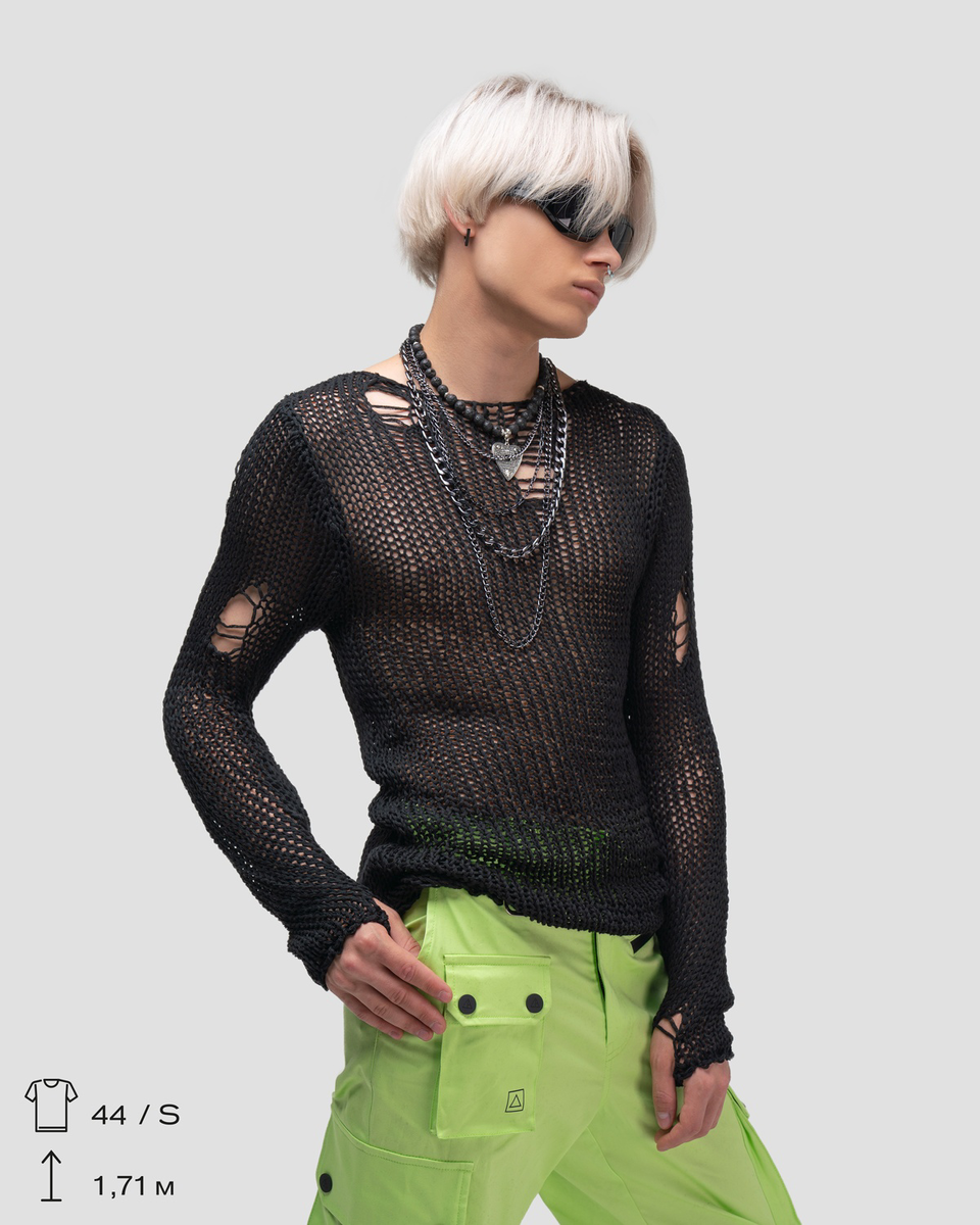 Сетка из хлопка с добавлением акрила. Хорошо тянется , с дополнительными акцентами в виде дырок из спущенных петель. На рукавах дырки под палец