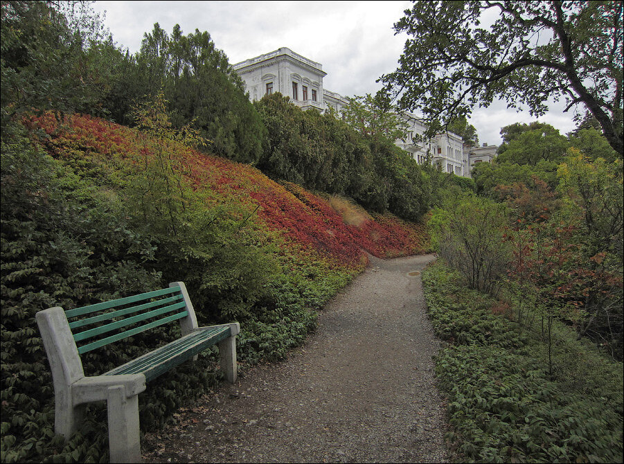 Вскоре мы вышли в дворцовый парк Ливадийского дворца. Пасмурнело всё отчётливее, и становилось ясно, что обещанный синоптиками дождь — буквально не за горами.