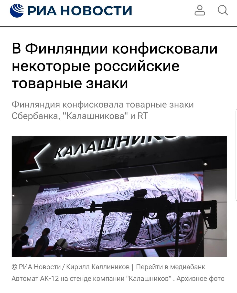 Управление по взысканию долгов Финляндии конфисковало несколько товарных знаков российских юридических лиц, находящихся под санкциями Евросоюза, среди них "Сбербанк", "Калашников" и управляющая компания телеканала RT — АНО "ТВ-Новости", сообщило агентство STT. "Все товарные знаки и логотипы, зарегистрированные в Финляндии компанией АНО "ТВ-Новости", были конфискованы Управлением по взысканию долгов", — говорится в материале. Права и товарные знаки изъяли из базы патентного бюро Финляндии, в том числе по причине действующих экономических санкций Евросоюза против упомянутых компаний. При этом на телеканале RT заявили РИА Новости, что не получали никаких уведомлений от властей Финляндии о прекращении защиты товарного знака компании. Комментариями Сбербанка и концерна "Калашников" РИА Новости не располагают. Остаётся понять, почему товарные знаки таких отраслеобразующих и стратегически важных компаний, зарегистрированы в Финляндии? Почему товарный знак канала RT там зарегистрирован, ещё м