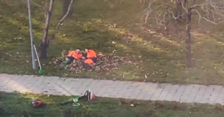 В сети пользователи делятся кадрами теплого осеннего дня. Кое-кто смог запечатлеть наслаждающихся солнцем коммунальщиков — двое мужчин прилегли на куче убранной листвы.