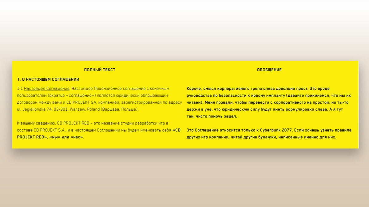 Вдохновением послужила оферта игры Cyberpunk 2077. В ней разработчики простым языком объяснили, чему посвящено новое лицензионное соглашение. Текст оферты начинается со слов: «Короче, смысл корпоративного трёпа слева довольно прост. Это вроде руководства по безопасности к новому импланту».