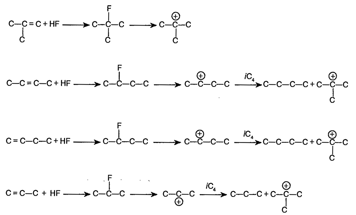 Алкилирование - один из типичных примеров реакций, основанных на механизме карбениевого иона. Эти реакции состоят из стадий инициирования, развития, а также (в ряде случаев) изомеризации. Кроме того, есть возможность протекания стадий полимеризации и крекинга, являющихся нежелательными побочными реакциями. Механизм реакции HF-алкилирования на стадии инициирования На стадии инициирования происходит образование третичных бутилкатионов, продолжающих затем реакцию алкилирования. Механизм реакции HF-алкилирования на стадии развития Реакции развития затрагивают третичные бутилкатионы, которые вступают в реакцию с олефином с формированием большего по размеру карбениевого иона, отнимающего затем гидрид у молекулы изобутана. При отрыве гидрида формируется изопарафин и новый третичный бутилкатион, который продолжает реакционную цепь. Механизм реакции HF-алкилирования на стадии изомеризации Изомеризация играет значимую роль для достижения высокого октанового числа из сырья богатого бутеном-1. Изо