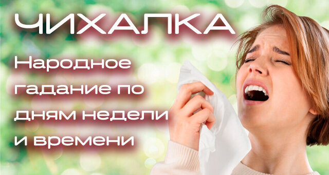 Гадание «Чихалка по времени» проверенный и доступный способ узнать недалёкое будущее. Достаточно запомнить день недели и час когда вы чихнули, а затем узнать толкование заглянув в гадание — Чихалка. Главное условие достоверности, это естественность. При намеренном чихании, гадание не будет правдивым. Если чихнуть при недомогании, Чихалка также не будет правильной.
