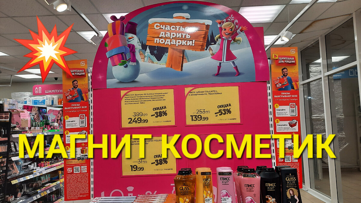 Всем привет,я рада,что вы заглянули на мой канал.Покажу вам,что можно купить со скидкой в Магнит Косметик. Такая праздничная витрина и в самом Магнит Косметик очень красиво . Адрес магазина Ростовская область,станица Мечётинская,ул.Ленина,50. Зубная паста Колгейт в ассортименте цена со скидкой 139.99 руб. Зубная щетка Колгейт цена со скидкой 199.99 руб. Шампуни и бальзамы Глисс Кур в ассортименте цена со скидкой 249.99 руб. Здесь и драгоценное питание,жидкий шелк и экстремальное восстановление. Контейнеры с декором Сочный урожай (Бытпласт) разные обьемы от 0.3 до 1 л и цены соответсвенно 39.99,49.99,59.99 и 69.99 руб. Будут зимой радовать вас и напоминать лето. Жироудалитель для плит и духовок 500 мл цена со скидкой 144.99 руб. Универсальное средство для кухни 500 мл цена 169.99 руб. Универсальное средство для чистки и обновления душевых кабин,джакузи,акриловых ванн и бассейнов,500 мл антибактериальный эффект цена со скидкой 189.99 руб. Стиральный порошок автомат Бимакс колор 3 кг це
